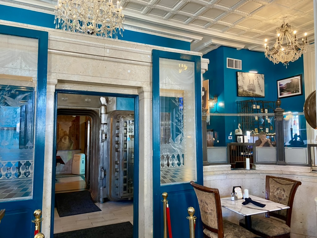 The interior still has much of the historic bank elements and decor, such as the 12 inch thick vault door, which opens to a private dining area accommodating up to 12 people. There are a lot of stained glass pieces throughout the dining room.