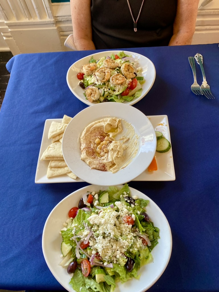We ordered a hummus appetizer which came with a generous portion of pita bread and a few carrots and cucumber slices, and followed that with a shrimp salad which my wife enjoyed. I had an equally tasty Greek salad. We ate lighter today, because we still had a long drive ahead.