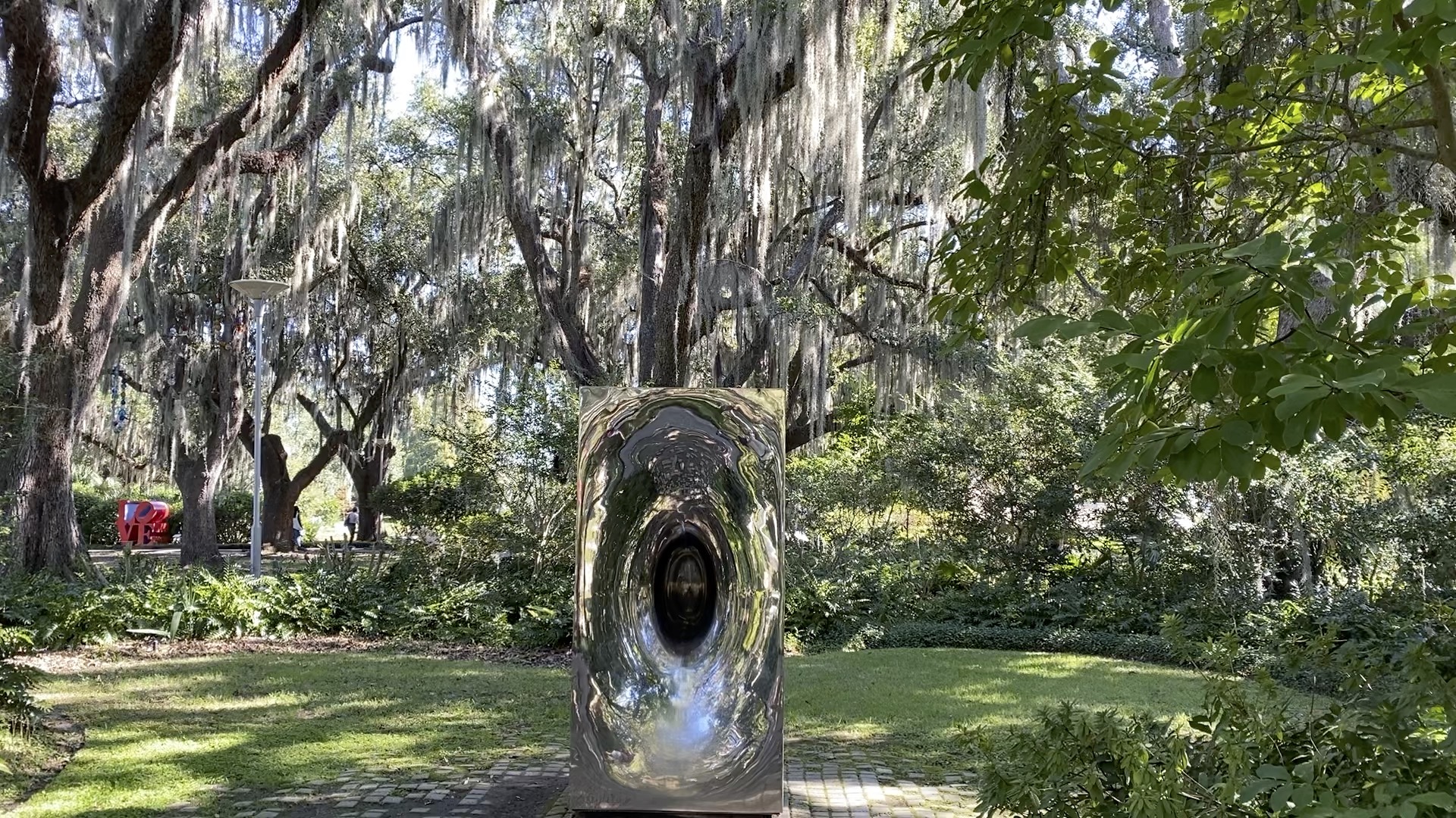 The Experience: As you walk around it, the reflection of the surrounding mossy trees and sky distorts, making the solid metal object feel almost liquid or ghostly.