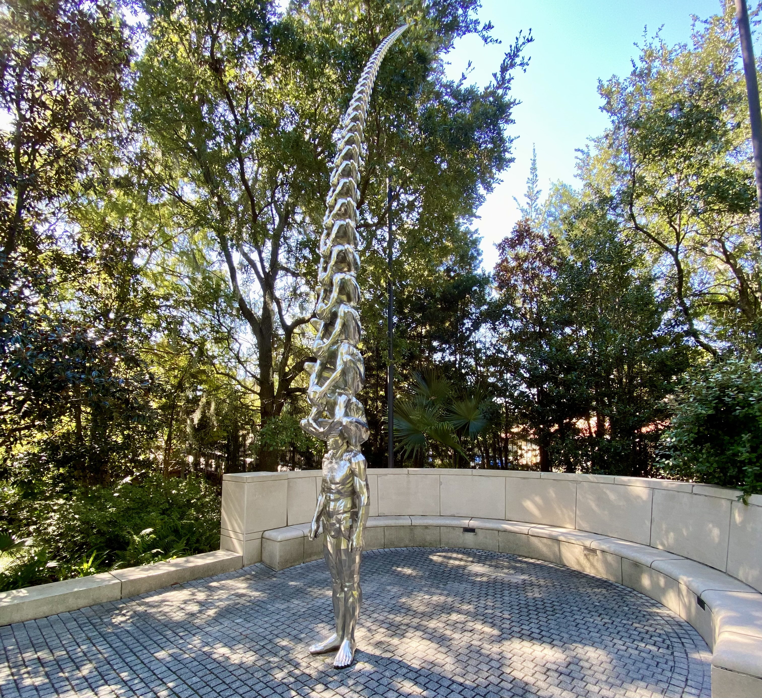 The Concept: It consists of 98 cast stainless steel figures. Each figure is blindfolding the one below it, creating a curved, spine-like column that reaches toward the sky.
