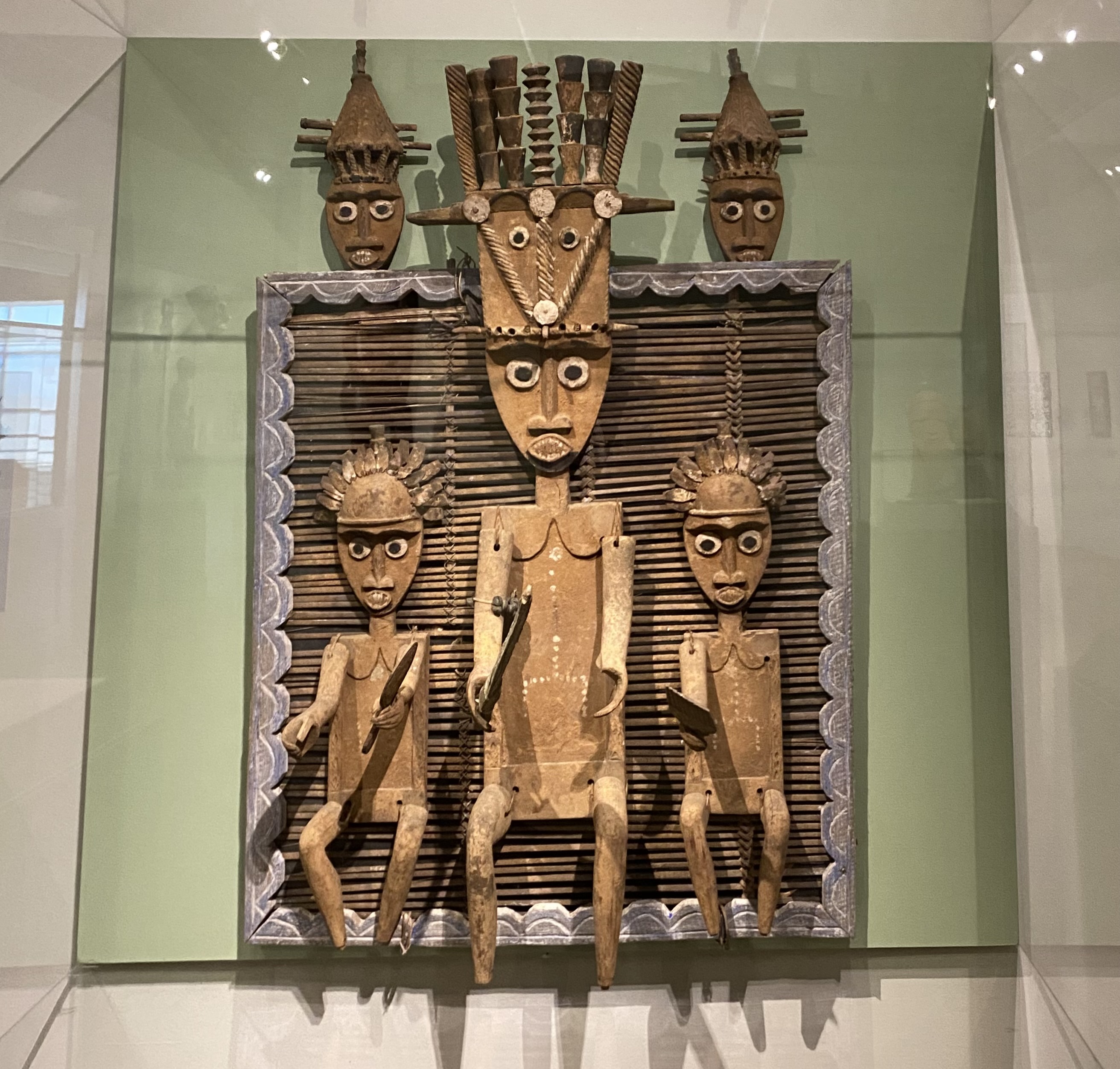 As is fitting for a wealthy trading tycoon, the central figure represents the deceased house leader wearing a masquerade headdress befitting his rank in life. The flanking figures represent his followers or powerful priests. All display symbols of status and authority, such as weapons and trade items. The white dots on their torsos represent bones, recalling ancestral connections to the human world. While the overall composition recalls European portrait conventions, the figures’ alert expressions, emblems of authority, and symmetrical geometric forms are distinctly Kalabari in character.